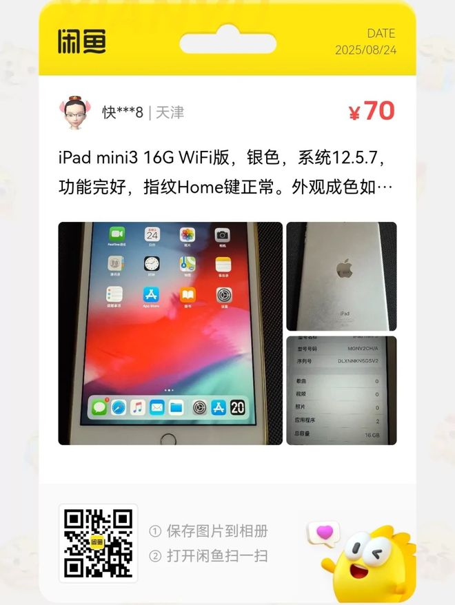 粉丝爆料分享了一台价格70元的iPad mini3 16G WiFi版,银色,系统12.5.7,功能完好,指纹Home键正常。