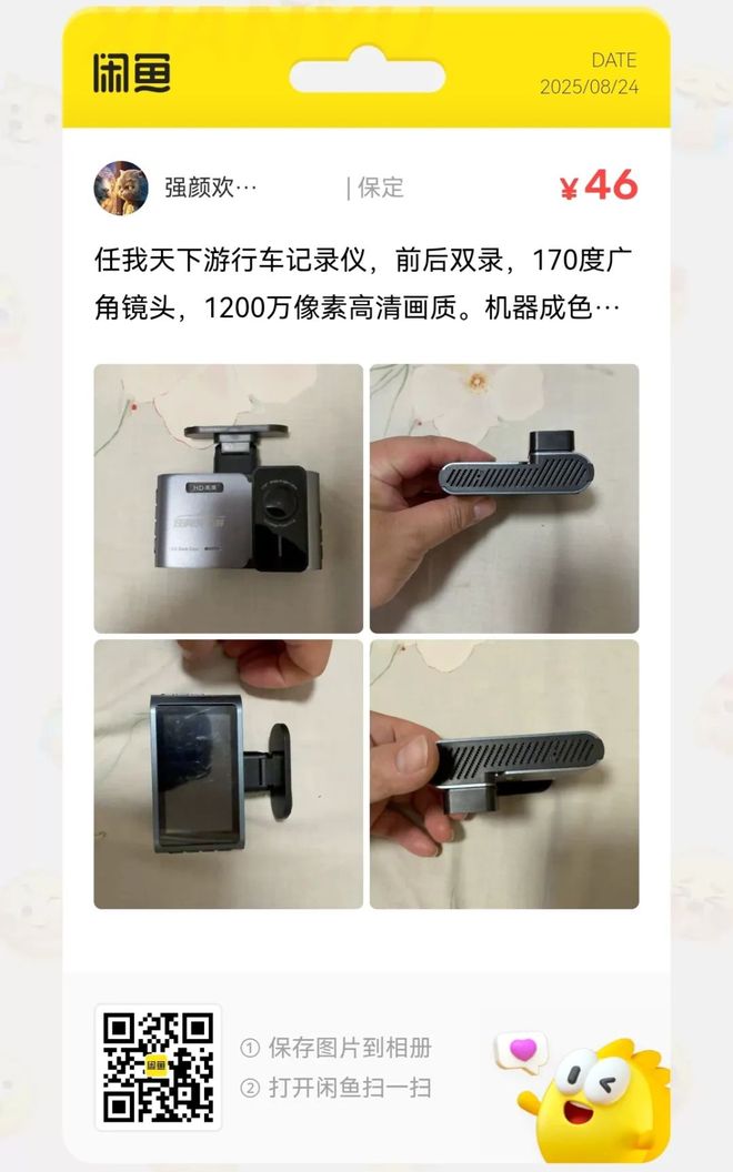 粉丝爆料分享了一台价格46元的任我天下车记录仪,前后双录,170度广角镜头,1200万像素高清画质。机器成色新,功能完好,支持前后双录,带内存卡。