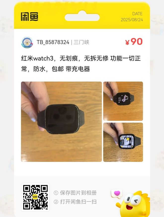 粉丝爆料分享了一台价格90元的红米watch3,无划痕,无拆无修 功能一切正常,防水,包邮 带充电器。
