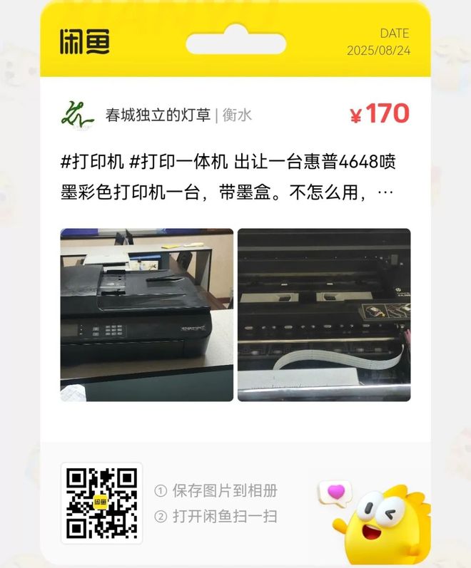 粉丝爆料分享了一台价格170元的惠普4648喷墨彩色打印机一台,带墨盒。