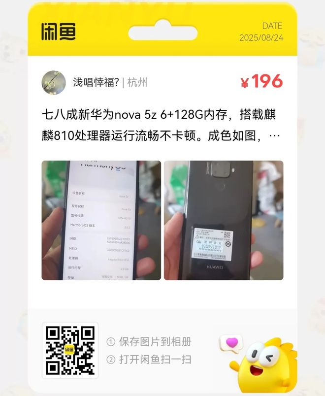粉丝爆料分享了一台价格196元的华为nova 5z 6+128G内存,搭载麒麟810处理器运行流畅不卡顿。