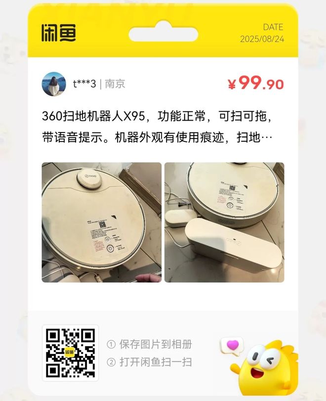 粉丝爆料分享了一台价格99元的360扫地机器人X95,功能正常,可扫可拖,带语音提示。