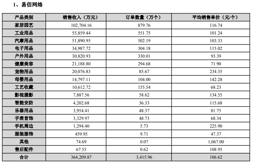 # 品类层面,易佰网络的家居园艺类产品表现最为突出,上半年销售收入超10亿元,对应订单数量约879万个,工业用品与汽摩用品类产品则紧随其后,构成营收的重要补充。