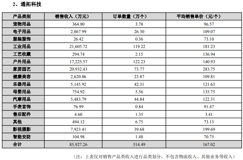 # 产品品类上,通拓科技以工业用品为核心,上半年销售收入约2.16亿元,订单数量约119万个,家居园艺、户外用品位列第二,与易佰形成品类错位优势。