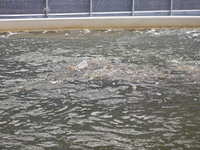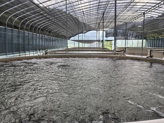 眼前的高密度养鱼基地,占地1亩,有两排共8口鱼池,每口直径8米、高2米,容量100立方米。鱼池内,底部环壁安装的增氧管,不停地吐着手指大小的氧气泡。